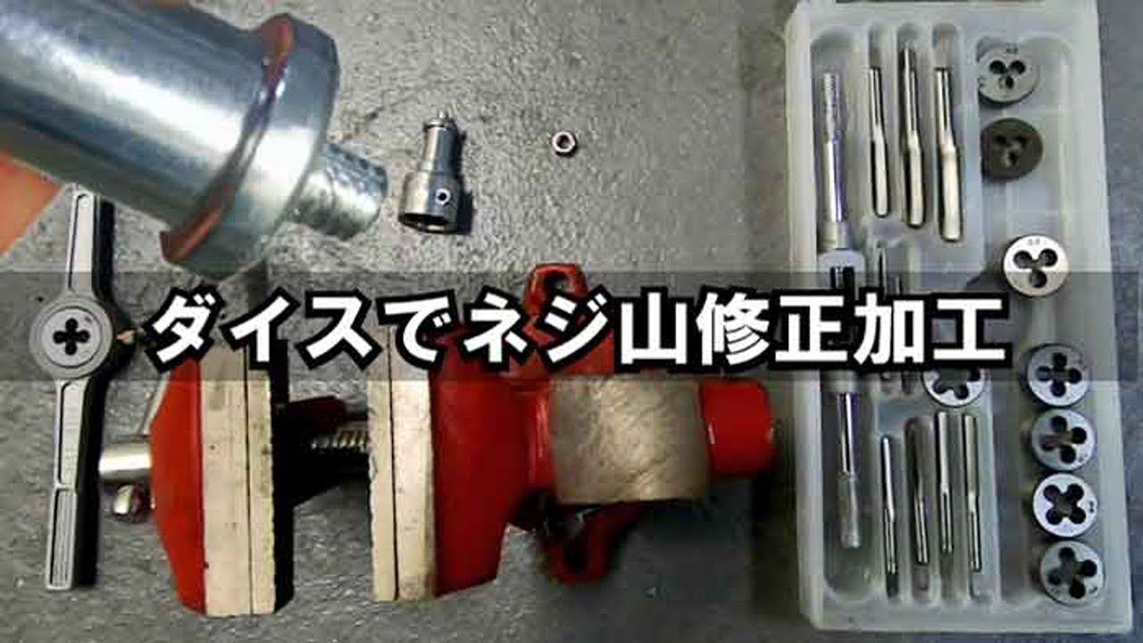 今回は失敗でツルツルのスピゴットになってしまったので、1/4雌ネジではなくてM6ナットで固定出来るようにダイスセットを使用してねじ切り加工をしました。